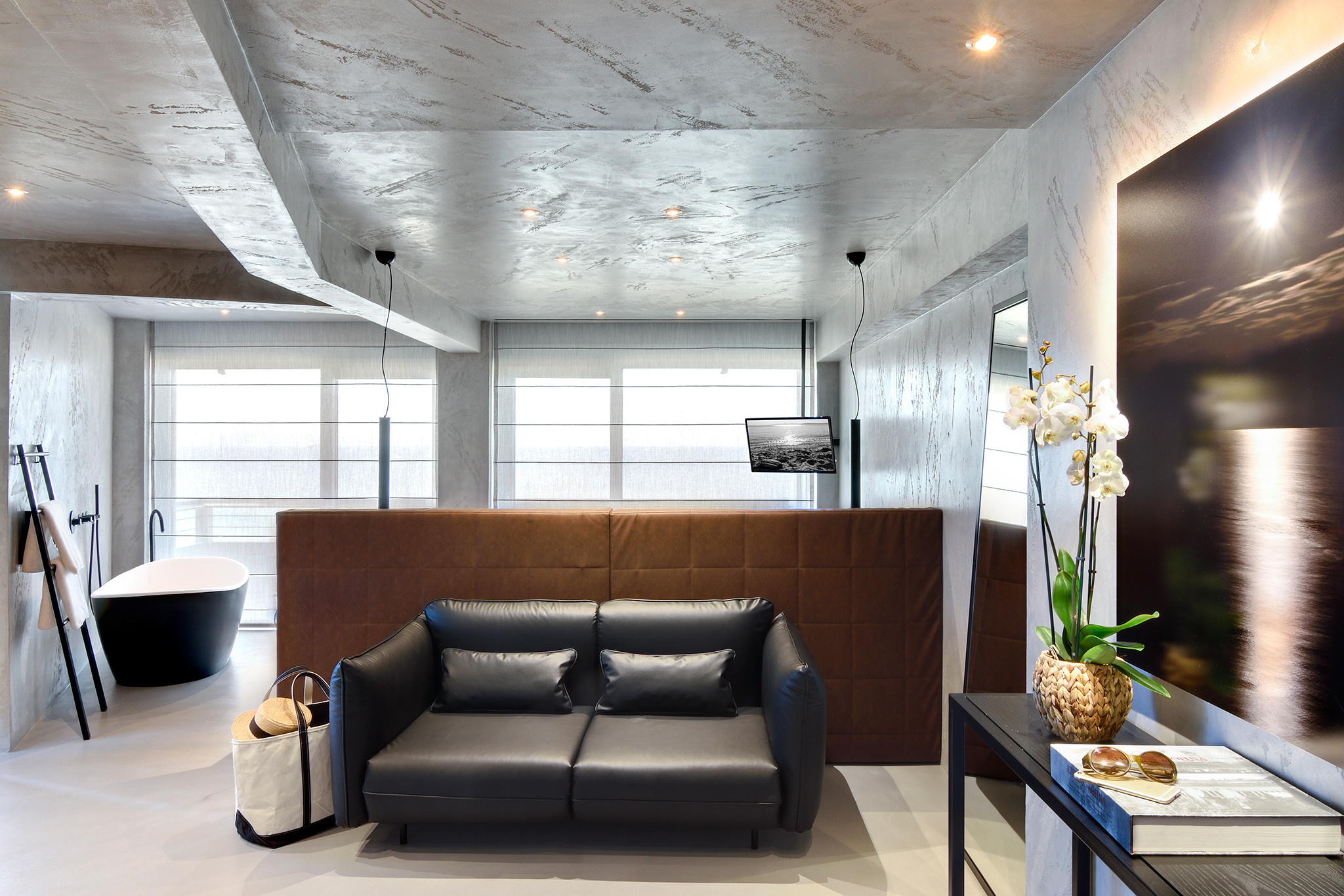 Η Junior Σουίτα με Θέα στη Θάλασσα αποτελεί μια νέα πρόταση σύγχρονης Αθηναϊκής πολυτέλειας. Η κομψή αυτή σουίτα δίπλα στη θάλασσα συνδυάζει εμφανές μπετόν με μίνιμαλ φιμέ γυαλί και οικολογικό φωτισμό, δημιουργώντας ένα εκλεπτυσμένο, αστικό ύφος.